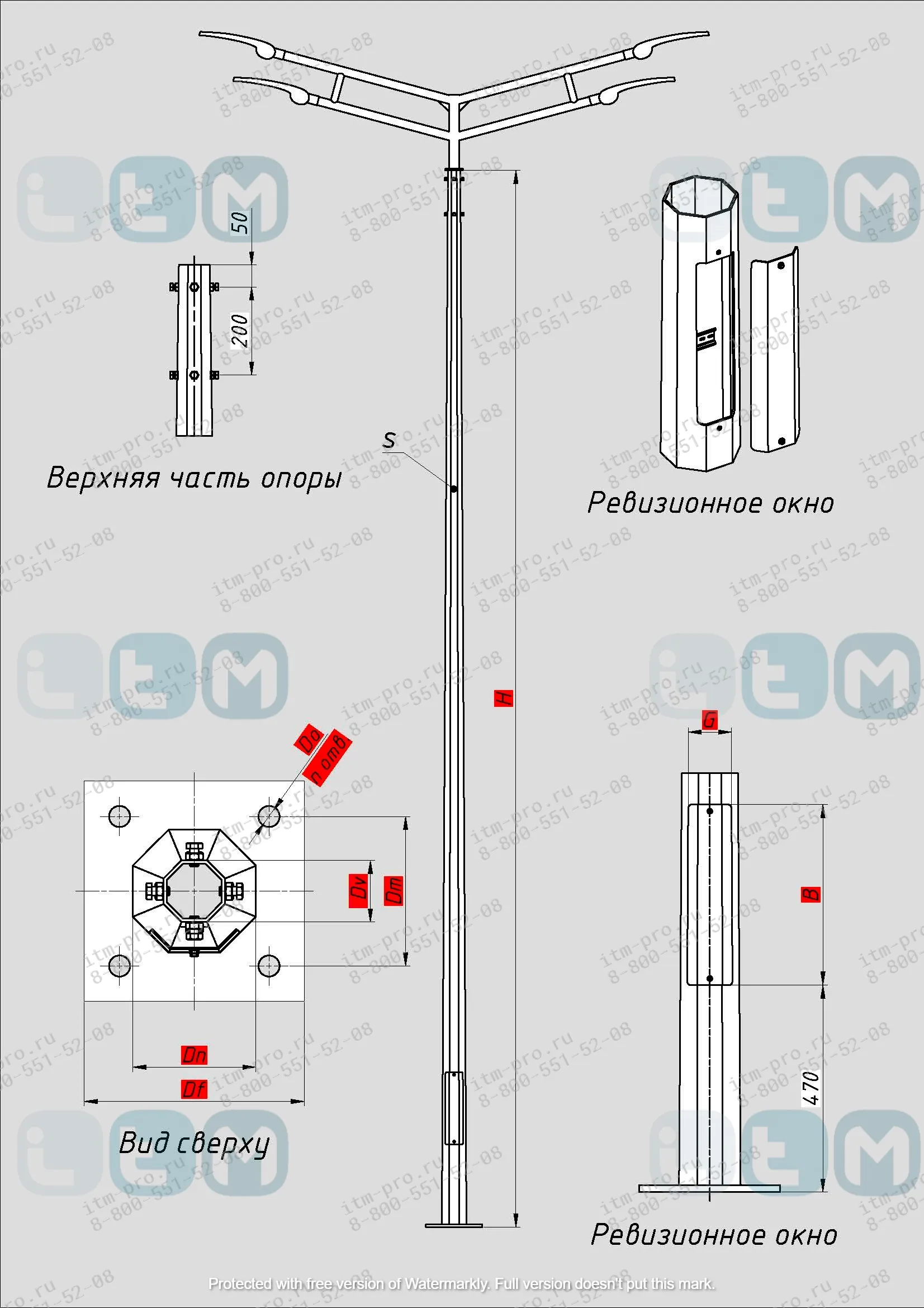 Граненая опора НФГ-10,0(75)-05-ц относится к несиловому типу опор освещения - подвод питающего кабеля возможен только под землей, для обслуживания подключения в опоре предусмотрен специальный лючок, расположенный в нижней части.