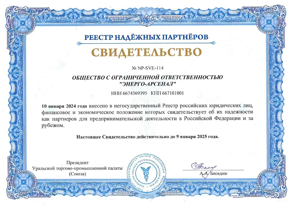 Сертификат подтверждает наличие у предприятия Энерго-Арсенал собственного производства на территории РФ.